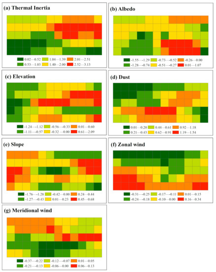The distribution of the coefficients of the affecting factors (thermal inertia (a), albedo (b), elevation (c), dust (d), slope (e), zonal wind (f) and meridional wind (g) for STR.