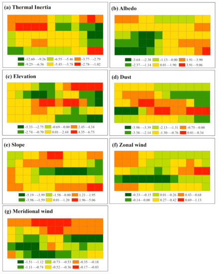 The distribution of the coefficients of the affecting factors (thermal inertia (a), albedo (b), elevation (c), dust (d), slope (e), zonal wind (f), and meridional wind (g) for SAT.