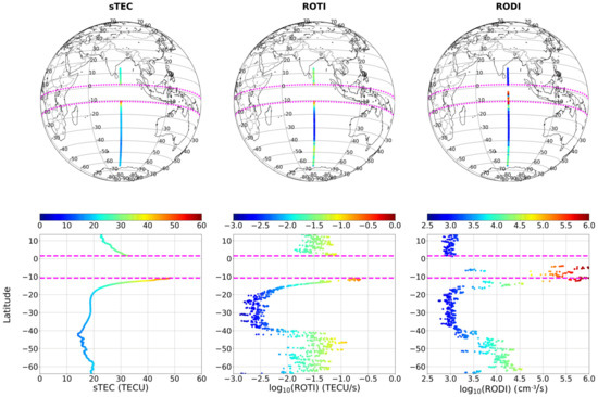 RODI values [26] can be obtained according to the procedure recently proposed by Pignalberi [27] through his TITIPy (Topside Ionosphere Turbulence Indices with Python) tool.
