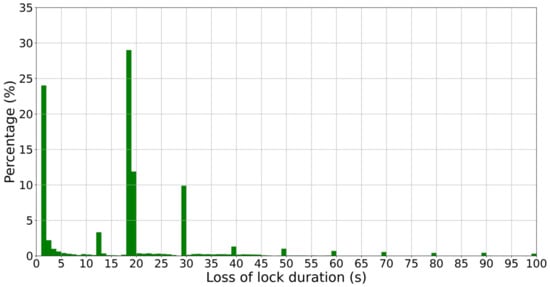 Figure 2 shows the distribution of the duration (in seconds), between 1 and 100 s, of the identified LoL events. The percentage of events whose duration is greater than 100 s is less than 5.5%. The largest fraction of LoL is made up of events whose duration is of 18 s (about 29% of the total) and 1 s (about 24% of the total). The other bins are unevenly populated. This distribution is consistent with that found by Xiong et al. [14], who analyzed data from December 2013 to November 2016.