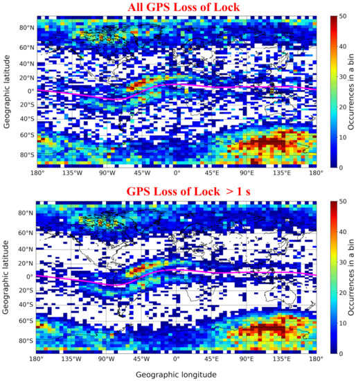 Figure 3. Geographic distribution of the GPS LoL occurrence affecting Swarm A, B, and C, from December 2013 to December 2020, considering (top panel) all LoL events, independently of the duration, and (bottom panel) considering only those events whose duration is greater than 1 s. The magenta curve visible in both panels represents the magnetic equator. - (2)