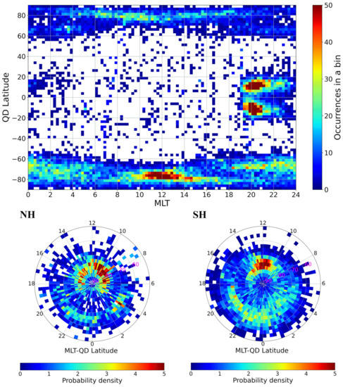 Figure 5 shows the distribution of LoL occurrences as a function of the QD latitude and Magnetic Local Time (MLT), in bins 2.5° and 15 min wide, respectively, in QD latitude and MLT, both as global and polar projection. Specifically, the polar projections show the probability density, just to better highlight which are the regions where the LoL occurrence maximizes. As expected, at low latitudes the events cluster between 19 and 23 MLT, the time window for which EPBs are most likely to occur, e.g., [69,70].
