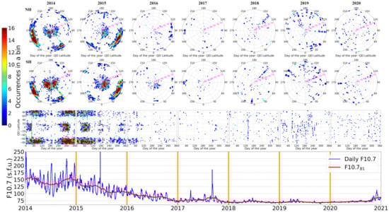 Same as Figure 4 but for each year of the considered dataset, from 2014 to 2020. Polar projection (where the radius is the QD latitude and the azimuth angle is the day of the year) (first row) for the Northern hemisphere, (second row) for the Southern hemisphere, (third row) global projection, (fourth row) daily values of the F10.7 solar index (in blue) and corresponding 81-days running mean F10.781 (in red).