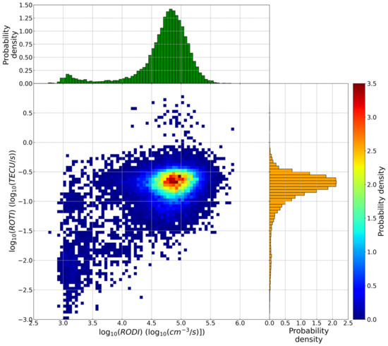 Joint probability density distribution of RODI and ROTI values at GPS loss of lock, independently of the QD latitude, for the period December 2013–December 2020. On the top and right panels, histograms of the probability density for RODI and ROTI are also reported.