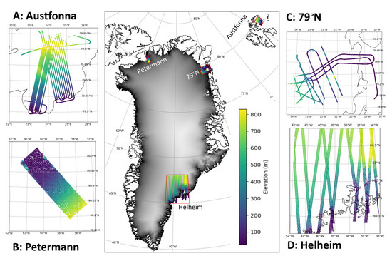 Location and coverage of four datasets used in this study. (A) Airborne ALS data from April 2016 over Austfonna ice cap in Svalbard; (B) airborne GeoSAR X-band data from April 2014 over Petermann glacier in Greenland; (C) operation Ice Bridge ATM data from 2017 over Nioghalvfjerdsfjorden glacier; (D) ICESat-2 laser altimetry data for Helheim glacier obtained in June 2019. Gray-shaded data plotted as background on Greenland are 1 km resolution DEM from ArctiDEM [25].