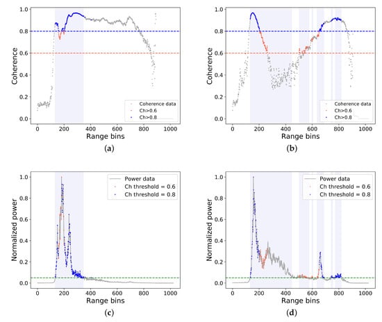 Coherence and power data from a CS2 track over Austfonna ice cap on 26 April 2016. (a,c) Northern part of the ice cap; (b,d) southern part of the ice cap. (a,b) Filtered coherence with threshold of 0.6 and 0.8 indicated by horizontal dashed lines; blue vertical box indicates area above the power threshold. (c,d) Power waveform, power threshold indicated by green line. Range bins for which the power was above the chosen limit are marked by shaded blue boxes.