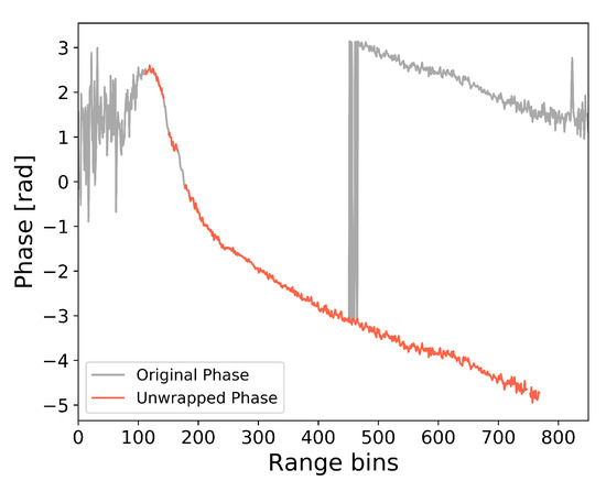 Filtering and phase unwrapping: An essential cornerstone of swath processing is to unwrap the phase information, i.e., correcting for local phase jumps of . However, differential phase must first be filtered to ensure correct phase unwrapping. This is performed to avoid misplaced echoes in the final elevation product, as changes in the phase generate a direct change in the location of the radar echo. Filtering is achieved by creating a complex interferogram and then separately filtering with a wavelet denoising method of the real and imaginary phases [12,36]. The complex interferogram is then recombined to create the filtered differential phase. An example of phase unwrapping is shown in Figure 3, where the original phase in gray shows a phase jump between range bin 400 and 500. The red line shows the correctly unwrapped phase that is used for further processing. Prior to unwrapping, the low-coherence part of the phase is masked out to avoid the unwrapping of the high-coherence part of the signal being affected by the inherent noise in the low-coherence parts.