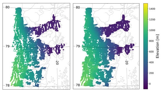 By applying the above steps, the swath processor could track the topography beyond POCA and reveal previously untracked topographic lows [11]. The improved method using swath processing can generate surface elevations from topographically challenging areas, and improve the coverage of small ice caps and the GrIS.