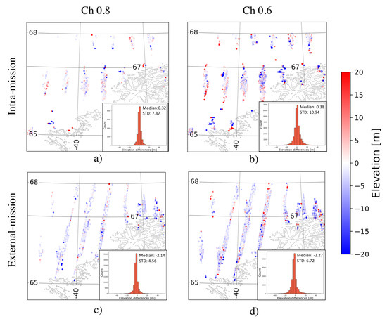 Results for Helheim area. (a,b) Intramission crossover elevation differences for coherence limits 0.8 and 0.6, respectively. (c,d) External-mission crossover analysis with ICESat-2 data for coherence limits 0.8 and 0.6, respectively. Corresponding histograms of elevation differences shown in inserts.