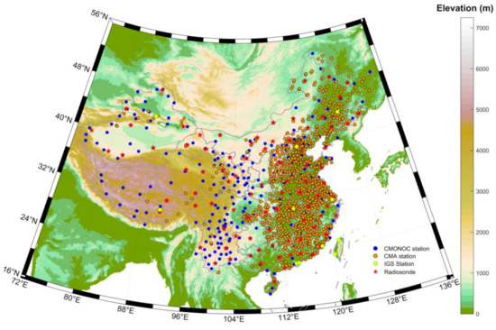 The research area is shown in Figure 1 which covers the whole China land region. The hills in the south, the plains in the north, the deserts in the northwest, and the Qinghai-Tibet Plateau make up the main geographical landscapes of China. Complicated terrain makes water vapor variation pattern very complex. In this study, we use 11 International GNSS Service (IGS) stations, 1052 China Meteorological Administration (CMA) GNSS stations, and 254 Crustal Movement Observation Network of China (CMONOC) GNSS stations to modify the accuracy of the MODIS PWV in 2019. We use radiosonde data to assess the accuracy of GNSS PWV, and the detailed information can be found in Appendix A.