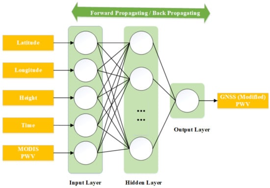 The structure of the MODIS–GNSS PWV BPNN model is shown in Figure 2. The input layer used in this study has five neurons corresponding to the longitude, latitude, elevation, observation time of a GNSS station, and the interpolated MODIS PWV at the GNSS station. In addition, there is only one neuron in the output layer corresponding to the GNSS PWV or the modified MODIS PWV.
