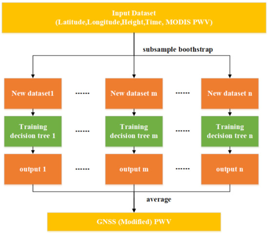 The Random forest is an ensemble learning method that can be used for regression or classification. The RF constructs a large number of decision trees during training and then outputs the mode of the classes or the average prediction of the individual trees [34,35]. The training method used in the random forest is called bootstrap aggregation. In other words, the RF uses a recursive partition method to generate many new datasets with same scale from the sample itself and then build models on each new dataset independently. Figure 3 shows the structure of the MODIS–GNSS PWV RF calibrate model. The input data include latitude, longitude, height, observation time of a GNSS station, and the interpolated MODIS PWV at the GNSS station. The output data are the GNSS PWV or the modified MODIS PWV. The final model result is the average of all decision tree results.