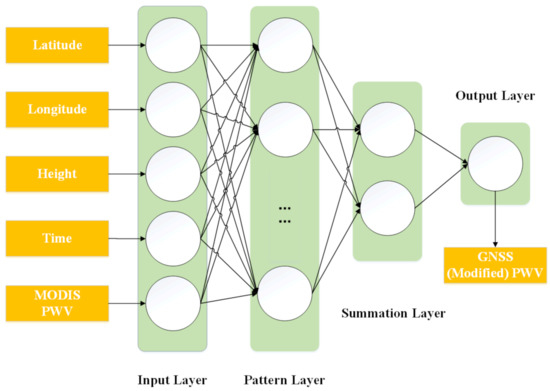 The GRNN was proposed by Specht in 1991 [36]. The GRNN has a strong nonlinear mapping capability and flexible network structure. Moreover, it has high fault tolerance and robustness. The GRNN is suitable for solving nonlinear problems. The GRNN has a four-layer structure with an input layer, a pattern layer, a summation layer, and an output layer. The number of neurons in the input layer is equal to the dimension of the input learning sample vector. Figure 4 shows the MODIS–GNSS PWV GRNN calibrate model. The input layer of the MODIS–GNSS PWV GRNN calibrate model has five neurons corresponding to the longitude, latitude, elevation, observation time of a GNSS station, and the interpolated MODIS PWV at the GNSS station. The number of neurons in the output layer is equal to the dimension of the output sample vector. There is only one neuron in the output layer in this experiment which is the GNSS PWV or modified MODIS PWV. The summation layer includes two types of summation neurons. They are used to compute the arithmetic summation and weighted summation of the outputs of all pattern layer neurons, respectively. The number of neurons in the pattern layer is equal to the number of learning samples. The transfer function of neurons in the pattern layer is