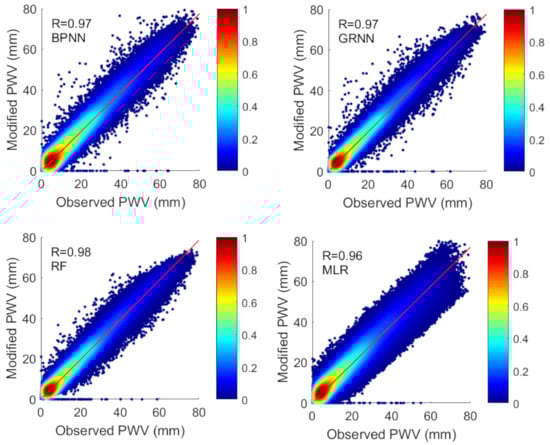 It is seen that the statistics with the modified and fitting PWVs are comparable, which indicates that all the trained models are not overfitting. The RMSs are reduced from original 5.8 mm to 3.9, 3.3, 4.1, and 5.0 mm after the training by the GRNN, RF, BPNN, and MLR, respectively, with improvements of 33.0%, 43.2%, 29.3%, and 13.8%. The correlation coefficient R is increased from 0.95 to 0.97, 0.98, 0.97, and 09.6 for the GRNN, RF, BPNN, and MLR, respectively. It can be seen that the RF has the best performance in training MODIS–GNSS PWV model in annual scale, and all three machine learning methods perform better than MLR method. This is because the machine learning methods are better to simulate the complex nonlinear relationship and the hidden features within the datasets [28].