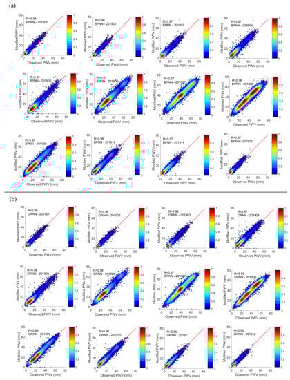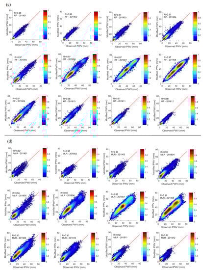 As shown in Figure 6, the modified MODIS PWV has a strong linear correlation with the GNSS PWV. For the RF, the smallest RMS reductions are 55.6% (January), 36.1% (May), 41.4% (June), and 51.4% (September), respectively, for the winter, spring, summer and autumn seasons. For the BPNN, they are 56.0% (February), 38.0% (May), 41.3% (June), and 49.9% (September), respectively. For the GRNN, the smallest RMS reductions for the four seasons are 60.4% (February), 40.3% (May), 47.1% (June), and 57.1% (September), respectively. The accuracy improvements, in terms of the RMS, of the monthly MODIS–GNSS models trained by the three methods are all greater than those of the corresponding annual models. In addition, all three machine learning methods achieve better performance than the MLR method in every month in 2019 since the RMSs of MLR method are greater than that of machine learning methods.