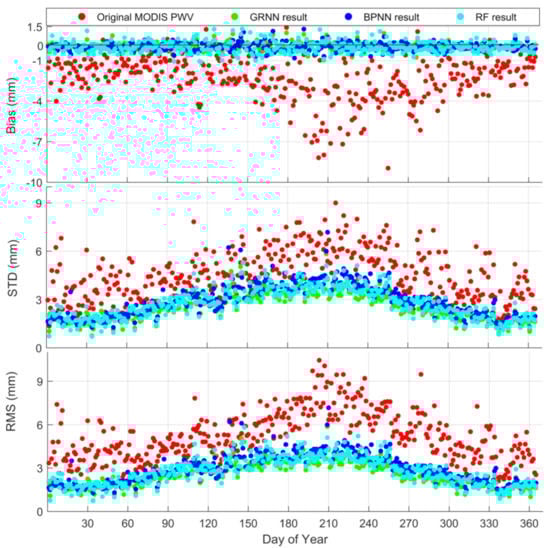 Figure 7 shows the daily Bias, STD, and RMS values in 2019. It is seen that these daily values vary with some patterns in 2019. For the STD and RMS, they increase from day 1 to day 210 and then decrease. Applying the three machine learning methods has effectively flattened the curves. The system difference between the original MODIS PWV and GNSS PWV is essentially eliminated, since all the bias values between the modified MODIS PWV and GNSS PWV are close to 0. The day-to-day STD and RMS variations are weakened after the modeling. In addition, as it can be seen in Figure 7, the GRNN models have the smallest STD and RMS, and the BPNN has the largest RMS, which indicates that the GRNN achieves the best performance among the three machine learning methods for the monthly modeling.