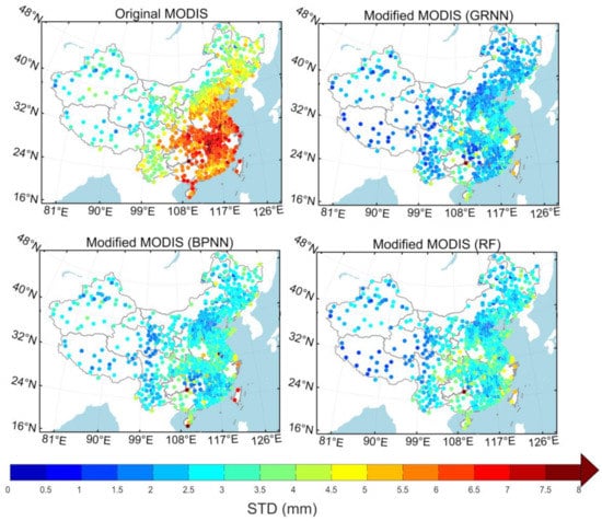 Figure 9 shows the spatial distribution of STDs of the differences between the original/modified MODIS PWV and GNSS PWV. The STD with respect to the original MODIS PWV is larger in the east of the Heihe-Tengchong line while smaller in the west of the line. The spatial distribution of STDs is much more even after the modeling by the three machine learning methods. It can be seen that the GRNN and RF achieve better performance than the BPNN, especially in Taiwan province. In most areas, the differences in STDs from the three models are only minor. It may be noted that the STDs with the GRNN method in the north of China are smaller than those with the BPNN and RF methods.