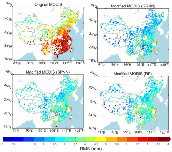 Figure 8 shows the biases between the original/modified MODIS PWV and GNSS PWV at the GNSS sites. As it can be seen from Figure 8, the biases are reduced in all regions for all three machine learning methods, which indicates that they can effectively eliminate the system deviation in any area. However, it is shown in Figure 8 that the bias of a very small part of the stations (e.g., along the Yangtze River, south-eastern China, and Shanxi province) is relatively large after modifying. In this subset of stations, data are available for only a small number of dates in 2019. The bias obtained from fewer data could not well reflect the real effect of the model.