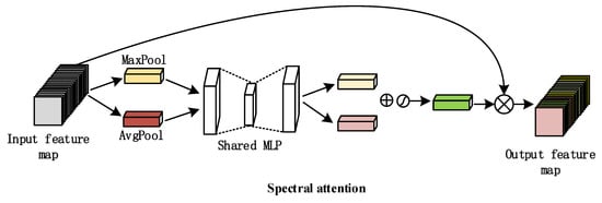 where , is at position (m, n), ⊗ represents the multiplication element, the output of spectral attention, and max(.)the maximum area. and represent the global average and maximum pooling, respectively. The first FC layer is used as a dimensionality reduction layer parameterized by W0, while the second FC layer is a dimensionality increasing layer parameterized by W1. refers to the ReLU activation function, and , , , W0, and W1 are shared weights. Finally, we multiply with the input to obtain .