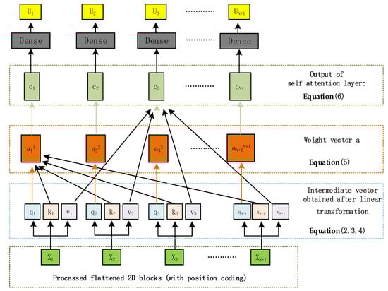 where , with N the number of flattened 2D blocks (Section 2.3 presents a detailed calculation of N). After that, we apply the dot product operation on the and , and divide by , where d is the dimensions of q and , respectively, to normalize the data. Finally, the weight vector is output through a softmax function. The vector depends on the vector and all vectors, and thus ultimately, Equation (5) produces in total N + 1 vectors with a length of N + 1 per vector.