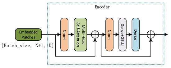 Once the raw HSI data are remapped into a set of ( ) image patches, we process each sample into an sequence of flattened 2D patches with shape (P, P, o). However, the transformer-model expects a two-dimensional NxD matrix as an input (Remove the Batch_size dimension), where is the sequence length and D the dimension of each vector of the sequence (Set to 64 in this article). Therefore, we reshape the 2D patches into a two-dimensional matrix of shape (, o × P × P), and apply a linear transformation layer on the latter two-dimensional matrices to ultimately create a two-dimensional Matrix (N, D). Then, we introduce the embedding vector and the position code (as described in Section 2.2) and create a matrix of size (Batch_size, N + 1, D) (Add Batch_size dimension) used as the input to the encoder block. Here, we use multiple encoder modules (the specific number of modules is discussed in Section 3.3.3) to continue extracting image features. In contrast to Dosovitskiy et al. [], we change the direct connection of a single encoder module and employ the residual structure to inter-connect each encoder module, with the detailed process shown in Figure 4. This strategy affords to reduce the information loss caused by stacking multiple encoder modules, and the model convergence speed is accelerated. The classification results are finally output through two fully connected layers.