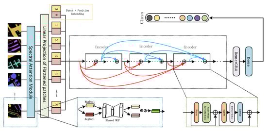 According to the transformer concept employed in NLP and the suggestion of Dosovitskiy et al. [], an image can be remapped into a sequence of flattened 2D patches . We extend [] and add a processing step where the patch image obtained from the original data is mapped through the spectral attention block to extract the relevant features. Thus, ultimately, we obtain N flattened 2D blocks of the same size, with the dimension of each block being , with P the size of the setting block, , and H, W, C are the width, height, and channel number of the image, respectively. Then, for each vector, we perform a linear transformation (fully connected layer) and compress the dimension into dimension D. As a reference, we use the encoder model of the transformer, and since the decoder model is not used, we add a learnable embedding vector and introduce a positional encoding . This process is represented by: