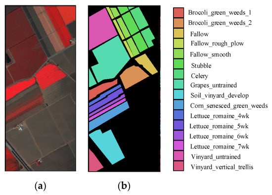 This dataset includes HSI collected by the Airborne Visible/Infrared Imaging Spectrometer (AVIRIS) sensor in Salinas, California, USA. It has 224 spectral bands and a spectral resolution of 400~2500 nm. Each HSI has a size of 512 × 217 pixels and a spatial resolution of 3.7 m/pixel. This dataset has in total 54,129 marked pixels presenting 16 object classes. The pseudo-color image and the corresponding ground truth map are illustrated in Figure 5, with the sample division ratio of the training and the test set shown in Table 2.
