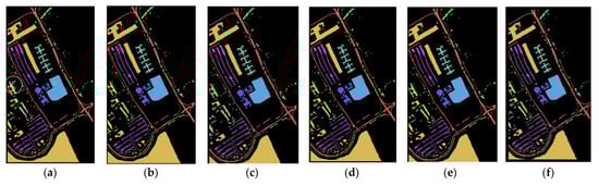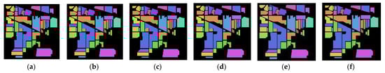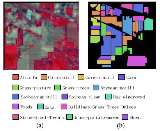 This dataset was collected by the AVIRIS sensor in Northwestern Indiana, USA involving 200 spectral bands and a spectral resolution of 400~2500 nm. It includes an HSI of 145 × 145 pixels and a spatial resolution of 20 m/pixel, with 10,249 marked pixels involving 16 object classes. The pseudo-color image and ground truth map are presented in Figure 6. The sample ratio between the training and the test set is shown in Table 3.