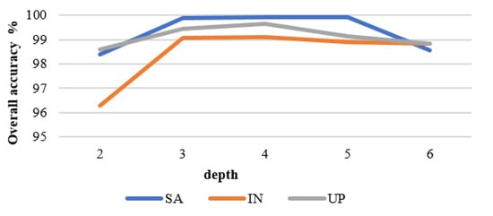 Here, we vary the number of stacked encoder blocks within the proposed SAT Net, with the stack cardinality set to 2, 3, 4, 5, and 6. The corresponding experimental results are shown in Figure 8, highlighting that as the number of encoder blocks increases, the classification accuracy increases, but also the total network parameters affecting the difficulty during network training increase as well. However, increasing the model parameters too much will cause the model to overfit and ultimately reduce its classification accuracy. For our trials, an encoder block cardinality of three manages a classification performance of 99.91%, 99.03%, and 99.47%, for the SA, IN, and UP datasets, respectively.
