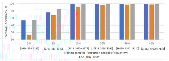 The proportion of training vs. testing data affects the fitting process of the model during its training. Hence, we evaluate the training proportions of 3%, 5%, 10%, 20%, 30%, and 40% of the entire dataset, with the corresponding results presented in Figure 9. From the latter figure, we observe that when the proportion of the training set is 3% and 5%, the classification result of IN is poor, and this is because the total number of samples in the IN dataset is relatively small. However, when the proportion of the training set exceeds 20%, all three datasets achieve quite appealing classification results. For the subsequent trials, and to compare our technique against current methods, e.g., Zhong et al. [], we set the training set ratio to 20% of the total samples.