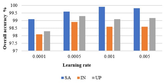 The learning rate affects the gradient descent rate of the model, and thus choosing an appropriate learning rate can control the convergence performance and speed of the model. For our experimental analysis, we set the learning rate to 0.0001, 0.0005, 0.001, and 0.005, respectively, with the corresponding results shown in Figure 10. We optimize SAT Net’s performance by setting the learning rate for SA to 0.001 and UP and IN to 0.0005.