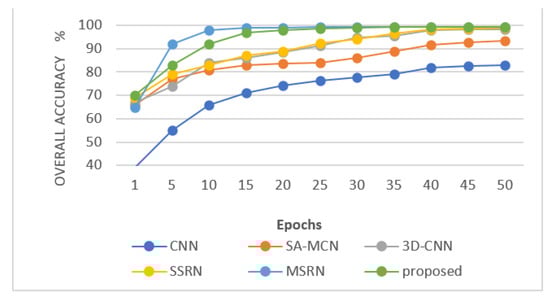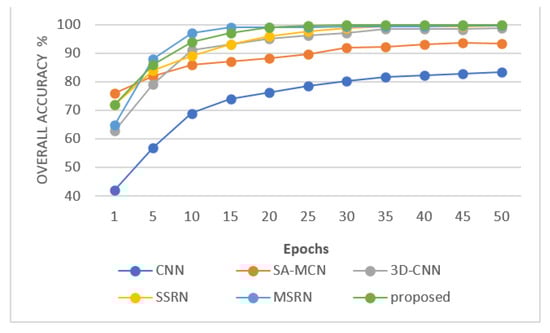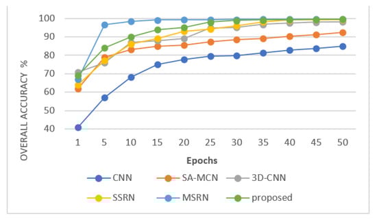 We challenge the proposed SAT Net against convolutional neural network (CNN) [] (CNN architecture with five layers of weights), spectral attention module-based convolutional network (SA-MCN) [] (Recalibrate spatial information and spectral information), three-dimensional convolutional neural network (3D-CNN) [], and the spectral–spatial residual network (SSRN) [], and the multi-scale residual network model with an attention mechanism (MSRN) []. For fairness, we set the ratio of training set and test set to 2:8. We also optimize the model by exploiting the Adam optimizer [] with a batch size of 64 and employ the cross-entropy loss function for reverse gradient propagation.