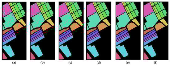 The classification map on the SA dataset for (a) CNN, (b) SA-MCN, (c) 3D-CNN (d) SSRN, (e) MSRN, and (f) proposed SAT Net.