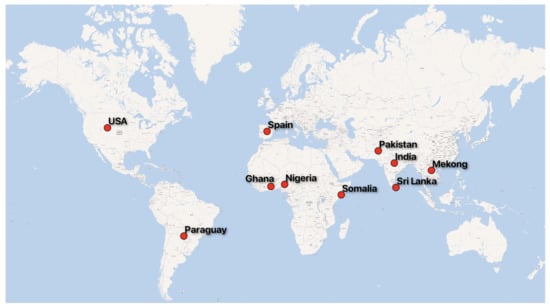 We utilize the Flood Event Data in the Sen1Floods11 dataset [] to train, validate, and test deep learning flood algorithms. This dataset provides raw Sentinel-1 SAR images (IW mode, GRD product), Sentinel-2 MSI Level-1C images, classified permanent water, and flood water. There are 4831 non-overlapping 512 × 512 tiles from 11 flood events. This dataset helps map flood at the global scale, covering 120,406 square kilometers, spanning 14 biomes, 357 ecological regions, and six continents. Locations for flood events are shown in Figure 1.