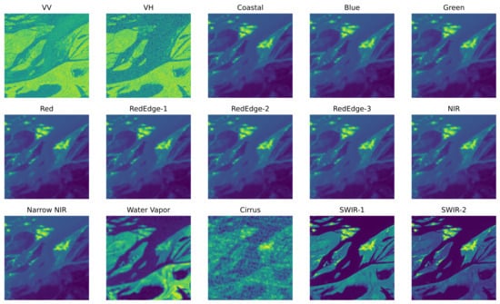 For each selected flood event, the time interval between the acquisition of Sentinel-1 imagery and Sentinel-2 imagery shall not exceed two days. The Sentinel-1 imagery contains two bands, VV and VH, which are backscatter values; the Sentinel-2 imagery includes 13 bands, and all bands are TOA reflectance values. The imagery is projected to the WGS-84 coordinate system.The ground resolution of the imagery is different on different bands. In order to fuse images, the ground resolution is sampled to 10 m on all bands. Each band is visualized in Figure 2.