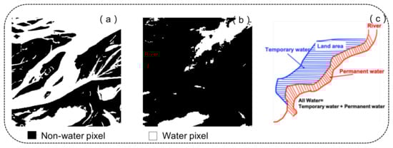 Illustration of water label. (a) example of hand labeled data of all water; (b) example of hand labeled data of permanent water; (c) the illustration of temporary water, permanent water, and all water.