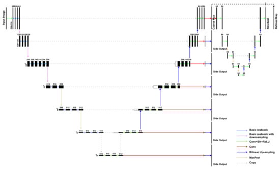 In the decoder part, each decoder stage corresponds to an encoder stage. As shown in the Formulas (1) and (2), is the merge base, is the feature map to be fused, is the merged feature map, and is a convolution layer followed by batch normalization and ReLU activation, RRM represents the Residual Refinement Module and the operator represents concatenation along the channel axis. There are three convolution layers with batch normalization and a ReLU activation function in each decoder stage. The feature map from the last stage is first fed to an up-sampling layer to get , and then concatenated with the current feature map . In order to alleviate overfitting, the last layer of the bridge stage and each stage of the encoder is fed to a convolution layer followed by a bilinear up-sampling layer and sigmoid activation function to generate a prediction map and then supervised by the ground truth: