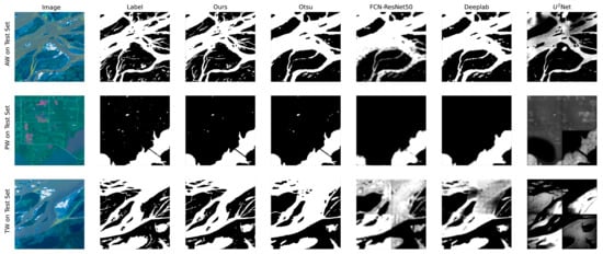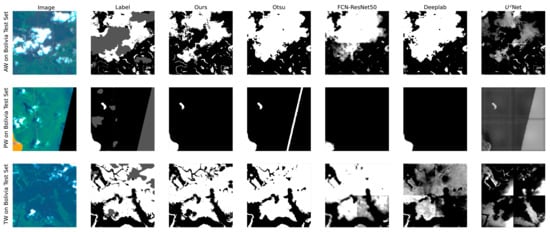 To evaluate our method, we conduct comprehensive experiments on the Sen1Floods11 dataset. On the one hand, since Sen1Floods11 is a newly released data set, there are few existing methods to conduct experiments on this data set; on the other hand, existing methods use different evaluation metrics, and the experimental results of different methods cannot be directly compared. Therefore, we reproduce the classical methods in remote sensing and some CNN (convolutional neural network)-based methods from classical to state-of-the-art to compare with our model under uniform experimental conditions and with the same evaluation codes. These methods include the Otsu thresholding method based on the VH band [], FCN-ResNet50 [], Deeplab v3+ [], and -Net [].