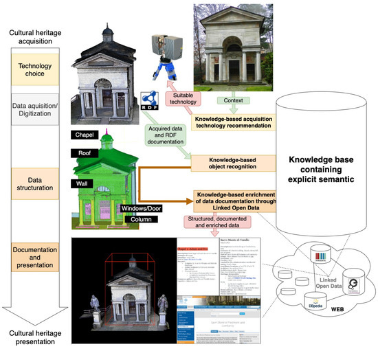 Since the world heritage convention in 1972, UNESCO has worked actively to protect endangered world heritage sites and objects. It concerns cultural heritage that is subject to serious deterioration; significant loss of historical authenticity; loss of cultural significance; and the threat of human planning, armed conflict, or environmental factors (e.g., climatic and geologic). Actions are taken to protect cultural heritage by avoiding and mitigating threats and deterioration wherever possible. However, it is difficult to face the time and its consequences on cultural heritage. Therefore, its digitization and digital preservation are an opportunity to conserve it and share it with the public and between different organizations. The digitization process aims at converting information into a digital format and results in a digital representation. To preserve digital representation, it is necessary to ensure continued access to digital materials for as long as required. In 2005, Europe initiated the creation of a common access point to Europe’s cultural heritage. Since this initiative, several European projects, such as the Europeana initiative (https://pro.europeana.eu/about-us/mission, accessed on 18 March 2021), ITN-DCH (https://www.itn-dch.net/, accessed on 18 March 2021), VIMM (https://www.vi-mm.eu/vimm-results/, accessed on 18 March 2021), and Dariah-EU (https://www.dariah.eu/about/mission-vision/, accessed on 18 March 2021), have been implemented to enable digital representation and the sharing of projects by making them reusable, visible, and sustainable. These projects promote cultural heritage documentation as Linked Open Data using semantic technologies. Linked Open Data and semantic technologies facilitate the sharing of data and face digital format evolution and change over time that threaten digital preservation sustainability. However, the process from the digital acquisition to cultural heritage presentation is a long and challenging path, where research work is still necessary to improve it. This interest has been reinforced mainly for 3D digitization by the signing of the 2019 Declaration of Cooperation on advancing the digitization of cultural heritage in Europe. This study presents the potential of semantics to facilitate the process from 3D cultural heritage data acquisition to its presentation and thus support the safeguard of cultural heritage. The semantic technologies allow the meaning that is implicitly contained in data to be explicitly described (in logical form). This explicit meaning expressed through semantics enables machines and people to understand, share, and reason with one another. The proposed method aims at improving the process from 3D cultural heritage data acquisition to its presentation by providing an end-to-end process guided by expert knowledge through the use of semantic techologies. Challenges and motivations related to such a method are detailed in Section 1.1, and the related work is presented in Section 1.2. The method and its used knowledge model are described in Section 2. This method is composed of three steps: