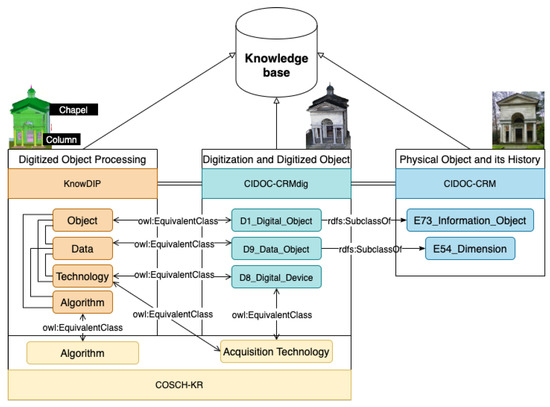 Three or four (by considering an extension of CIDOC-CRM as one itself) ontologies have been integrated into the knowledge base. These ontologies are CIDOC-CRM, CIDOC-CRMdig, COSCH-KR, and KnowDIP. CIDOC-CRM is a standard to document cultural heritage (as presented in Section 1.2). It allows us to describe physical objects associated with historical events, the place of events, and other cultural heritage information. CIDOC-CRMdig is an extension of CIDOC-CRM, specialized in representing the digitization process and resulting digitized objects. It allows the description of digitized objects associated with their digitization process and device. COSCH-KR or COSCH Knowledge Representation focuses on knowledge related to acquisition technologies and processing algorithms suitable for a cultural object type. KnowDIP vocabulary represents data processing knowledge. It describes mainly objects, data, acquisition technologies, and algorithms. These four main concepts are linked to allow the selection and execution of algorithms according to knowledge about objects to recognize and data to process.