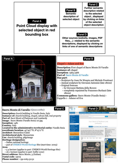 The created Web interface is presented and explained in Figure 3. It is composed of four main parts. The first part (panel A in Figure 3) allows the display of the point cloud and the selection of the objects inside. The second part (panel B in Figure 3) always shows semantic information related to the selected object. The third part (panel C in Figure 3) displays further semantic information related to links clicked in the second part of the interface or links clicked directly in this part. This allows navigation among the knowledge base. The last part (panel D in Figure 3) allows other sources of information to be displayed, such as websites, images, and documents related to links clicked in the second or third part.