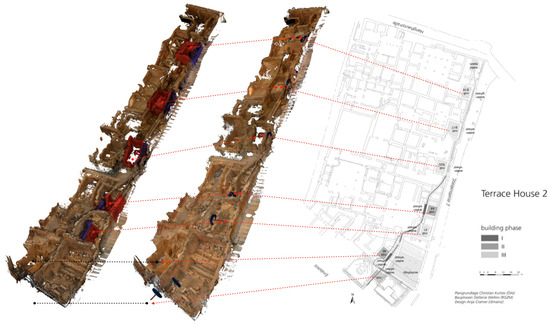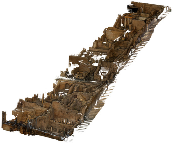 The Ephesos ruin is composed of three main areas: the Byzantine city, late antique urban areas, and imperial urban areas. Terrace house 2, on which this paper focuses, belongs to the imperial urban area. Terrace house 2 is an ancient ruin of about 100 × 50 m, excavated in the 1960s to 1980s, and partially 3D digitized in 2009/2010 (https://www3.rgzm.de/ephesos/, accessed on 7 May 2021) [43]. Figure 4 illustrates the 3D digitized part of the terrace house 2. This 3D point cloud was acquired through the terrestrial laser scanner Leica HDS6000. It was then cleaned, registered, colored by combining images taken by an external reflex camera, denoised, and reduced. The point cloud is composed of 95,571,517 points. This digitized part is mainly composed of watermills and workshops, whose architectural structure components are in varying conditions: complete, incomplete, fragmented, and displaced.