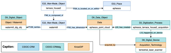 This case study focuses on recognizing and documenting the archaeological remains of watermills in terrace house 2. A watermill is composed of two rooms: one with a size of ca. 3 × 4 m that hosted the gearing mechanism and millstones in Late Antique/Early Byzantine times and a narrow room of ca. 0.60–1 m width corresponding to the waterwheel channel. In addition to providing the acquired data, the proposed method requires the user to provide information on its acquisition through RDF representation based on CIDOC-CRM and CIDOC-CRMdig ontology. The RDF representation for the acquisition of the watermills in Ephesos terrace house 2 is illustrated Figure 5.
