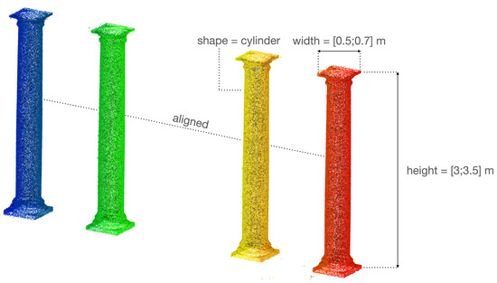 The case study of the first chapel of Sacro Monte is composed of three main objects: the chapel, two statues, and stairs. The chapel is described as a composition of other objects, which are the roof, wall, floor, column, arch, molding, vault, door/window, and stairs. Each object is described as a composition of other objects or through a geometry. They are characterized by different characteristics (such as colors, width, and height) and topological relations with other objects. Taking the example of a column description, illustrated in Figure 8, a column is described through the geometrical shape of a cylinder. It has a width of between 0.5 and 0.7 m and a height of between 3 and 3.5 m. The column description also contains a relation description with other columns: columns are aligned.
