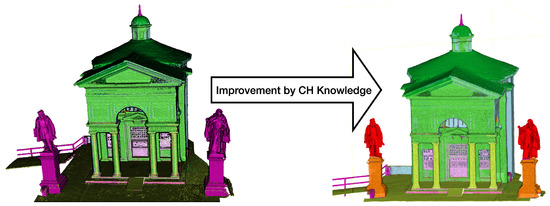 The recognition of objects in the chapel provides a basis for locating and identifying different portions of the point cloud. Although it is not perfect, its quality is comparable to that obtained by the literature’s best classification approaches. The quality of the detection depends mainly on the quality of the knowledge that describes the objects that need to be recognized. In this case study, the columns’ knowledge is sufficiently accurate and diversified to allow a detection process with an accuracy of 99.9%. On the contrary, if the objects’ knowledge is not sufficient, such as that for the arch and stairs, then the objects are less recognized (e.g., only 25% of the arch and stairs are recognized). However, this knowledge can be enriched in a supervised way by experts or automatically with approaches such as [40,51], which use a self-learning process based on ontologies to enrich the knowledge.