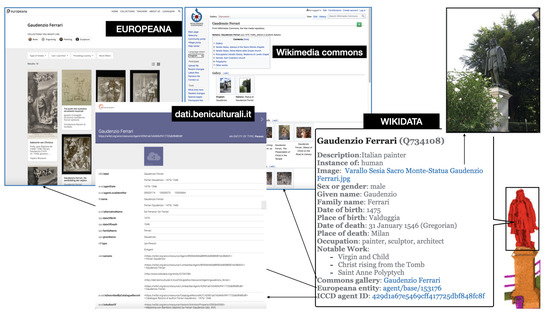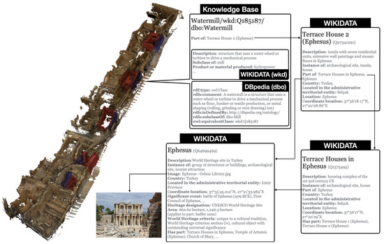 The previous object recognition step provides the first level of data documentation with a label, a type, and geometrical information (as dimensions and shape) that characterize the cultural objects. However, it does not provide cultural and historical information related to these objects. Such a second level of documentation with related historical and cultural information is the enrichment process’ goal. The enrichment process uses Linked Open Data (e.g., Wikidata (https://www.wikidata.org, accessed on 7 May 2021), DBpedia (https://www.dbpedia.org, accessed on 7 May 2021), and Europeana (https://www.europeana.eu/portal/en, accessed on 7 May 2021) [42], etc.) to retrieve knowledge and information related to the recognized cultural heritage objects.