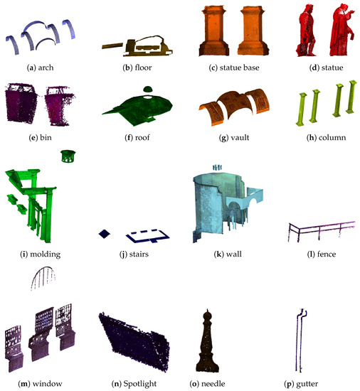 The optimal result is obtained by using the knowledge of all the object categories that compose the point cloud to force the points’ classification into one of these classes. Figure 18 shows an isolated view of the recognized objects for each of these categories (arch, floor, spotlight, statue base, bin, gutter, roof, vault, column, molding, stairs, wall, fence, needle, statue, and window).