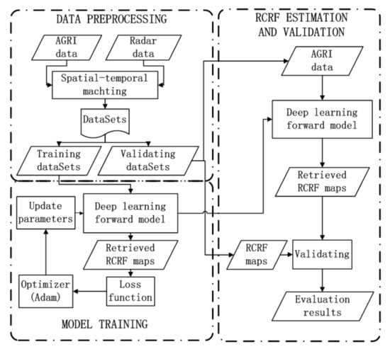 To develop the retrieving method for RCRF maps, we explore a deep learning method that consists of three modules, including data preprocessing, model training and RCRF validating based on three independent datasets, i.e., a training dataset, a validation dataset and a test dataset (Figure 1). The training dataset is used to train the model by optimizing its learnable parameters with the back-propagation algorithm. To evaluate the performance of model, the independent validation dataset is used to assert its ability to generalize well to unseen data, i.e., to make sure that the model is not overfitting.