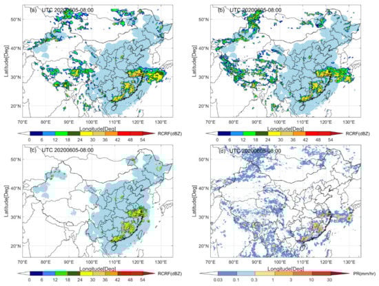 (a) RCRF maps (dBZ) retrieved from infrared channels, (b) visible channels and (c) ground-based radars, and (d) the corresponding precipitation rate from the GPM IMERG data (mm∙h−1) at 08:00 UTC on June 5, 2020. The light blue areas are the regions covered by radar echoes.