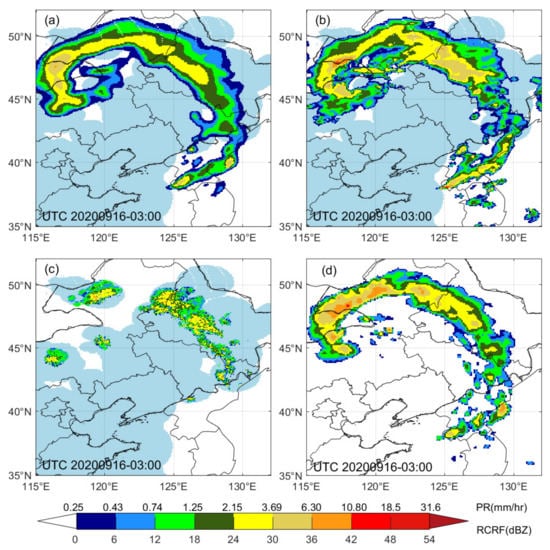 To validate the retrieved RCRF results using rain/snow measurements, this study also refers to some research on precipitation issues/surface observations [54,55]. The precipitation rate maps have been obtained from the retrieved RCRF maps by using the standard Z–R relationship (see Equation (5)).